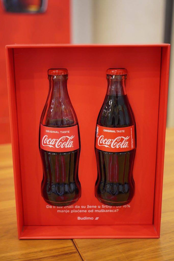 Kako bismo pokazali da razlika nije minimalna nego jasno vidljiva, dan pre 8. marta 2020. na adrese odabranih medija, partnera i influensera, poslali smo Coca Cola Budimo jednaki pakete u kojima se nalaze dve flašice, od kojih je jedna za 16% manje napunjena.
